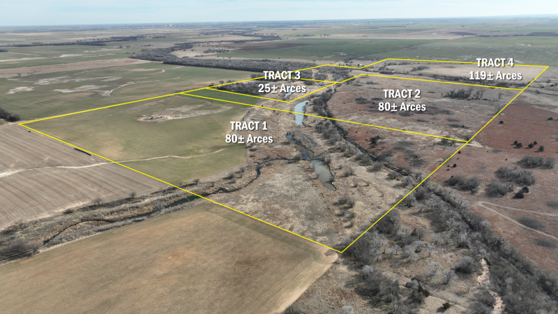 LOCATION: From Attica, to access Tracts 1, 2, and 3, travel 4 miles east on Hwy 160 then 1 mile south on 60th Ave. To access Tract 4, from Attica, travel 3 miles east on Hwy 160 then 2 miles south on 70th Ave. Turn east on NW 40th Rd and proceed for ½ mile. The boundary for Tract 4 is on the north side of the road.