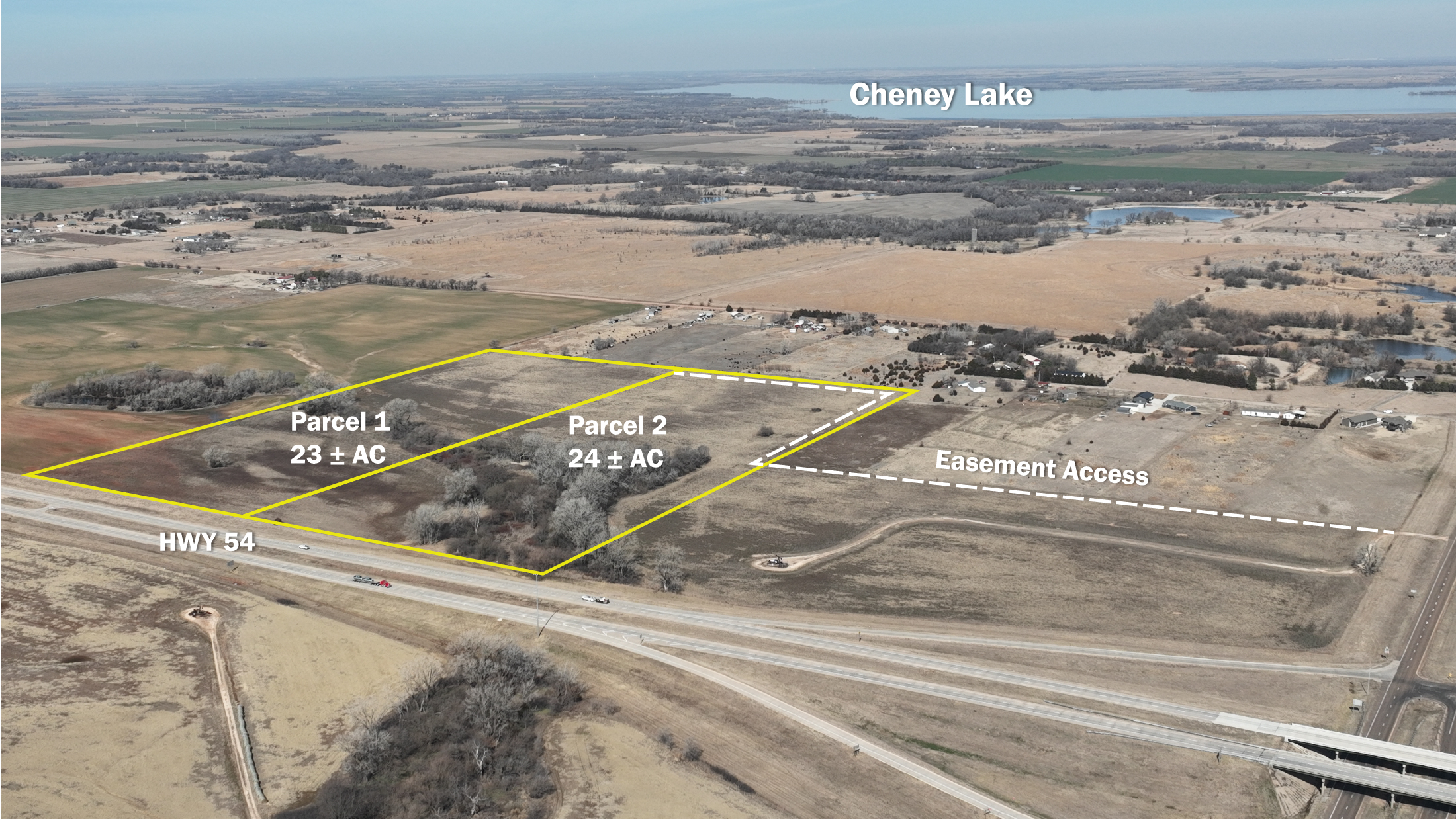 Head north on 391st W from Cheney 3 miles. Parceled acreage is on the NW corner of the overpass (Hwy 54).