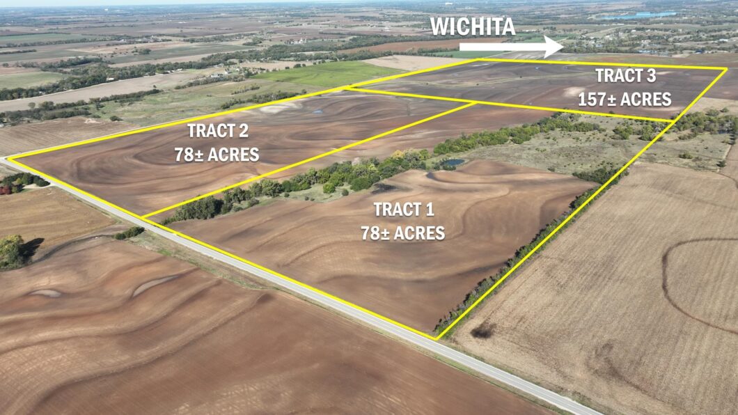 Offers 78± acres of rolling cultivation on the corner of 71st St S and 247th St W. With blacktop frontage and proximity to Wichita, Goddard, Garden Plain, and Clonmel this property could continue to be farmed or developed for growth in southwest Sedgwick County. If tract 1 or tract 2 are purchased individually, a survey will be completed at the seller’s expense.