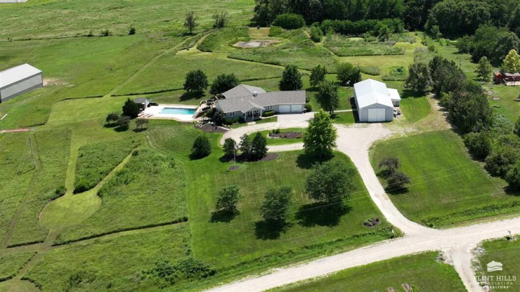 Welcome to your dream retreat on 6+/- stunning acres! This thoughtfully designed ranch home offers over 3,300 sq ft of living space with a fully finished walk out basement. Enjoy 4 bedrooms, 3 bathrooms, and open concept layout perfect for everyday living and entertaining. The gourmet kitchen features custom cabinetry, stainless appliances, and ample workspace, flowing seamlessly into spacious dining and living areas. Step outside to your private oasis featuring a saltwater pool, pool house, and waterfall. The oversized 2 car garage offers ample storage, while the impressive 40×70 shop includes electricity, partial gravel & concrete flooring, workbenches and shelving—perfect for hobbies or projects. Don’t miss your chance to own this rare combination of acreage, amenities and craftsmanship! Experience luxury country living with room to relax, entertain, and enjoy the outdoors. Just minutes from Manhattan and in Rock Creek school district! Call Lori Rogge, Broker at 785 556 7162